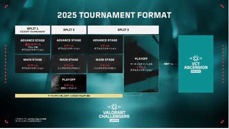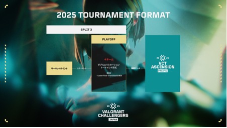 2025シーズンのVALORANT Challengers Japanは3スプリット制で実施され、優勝チームには「インターナショナルリーグ」への昇格戦「VCT Ascension」への出場権が与えられます。