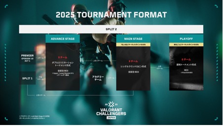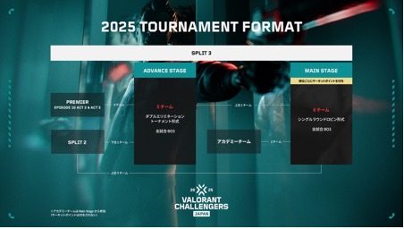 アドバンスステージには「Premier(V25A1)」を勝ち抜いた2チームとスプリット1メインステージ下位6チームが出場し、ダブルエリミネーション形式で対戦します。 続くメインステージにはアドバンスステージを勝ち抜いた2チームとスプリット1メインステージ上位4チームにアカデミーチームを加えた8チームが進出。シングルラウンドロビン形式で対戦します。