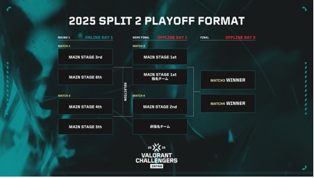 スプリット2プレイオフはメインステージ上位6チームによって行われ、メインステージ1位と2位はオフラインに出場、3位から6位はオンラインプレイオフでオフライン出場権2枠をかけて戦います。