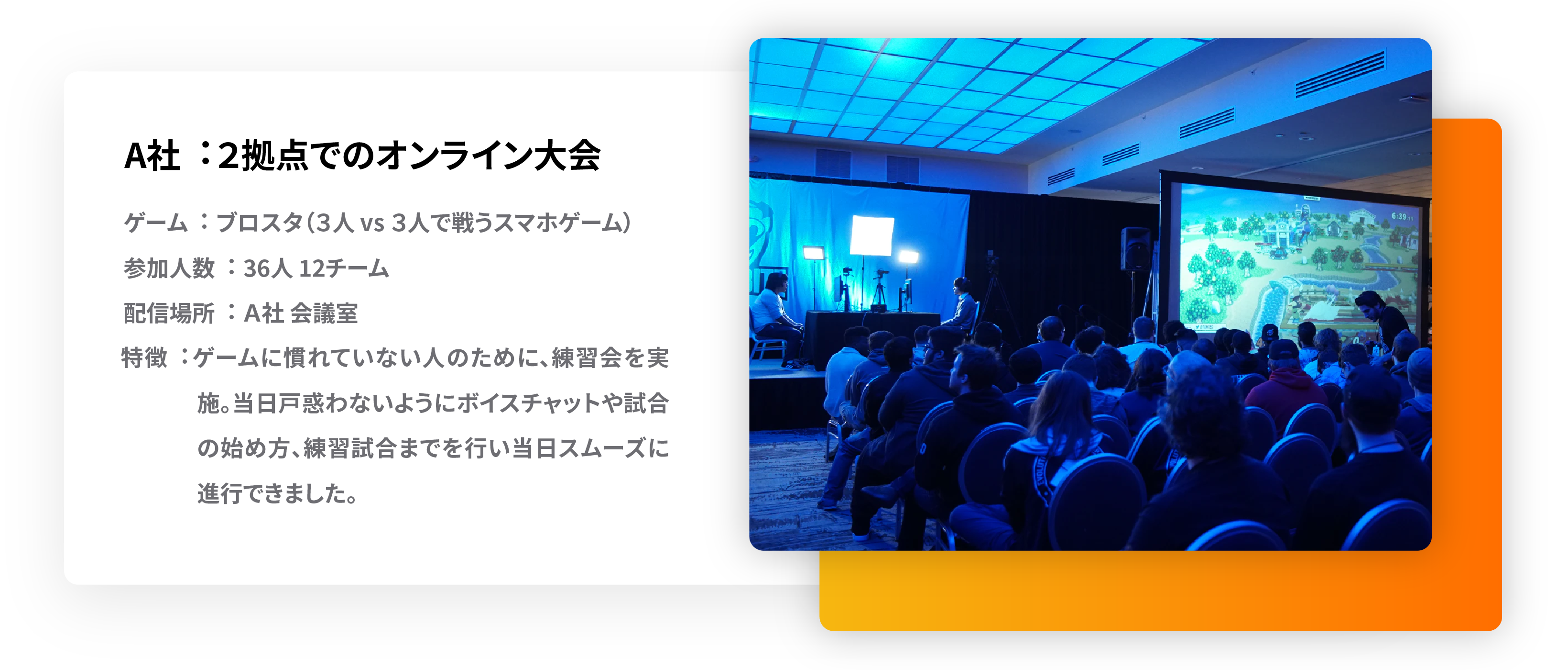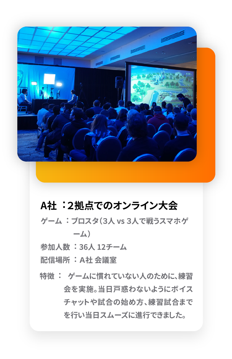 試合を参加者全員で応援したい、役員や経営層にも⾒て欲しい、プロの実況を頼みたい…eスポーツ⼤会のプロが、カメラ・マイク・ゲーム映像を作り、社内限定の配信として提供します。